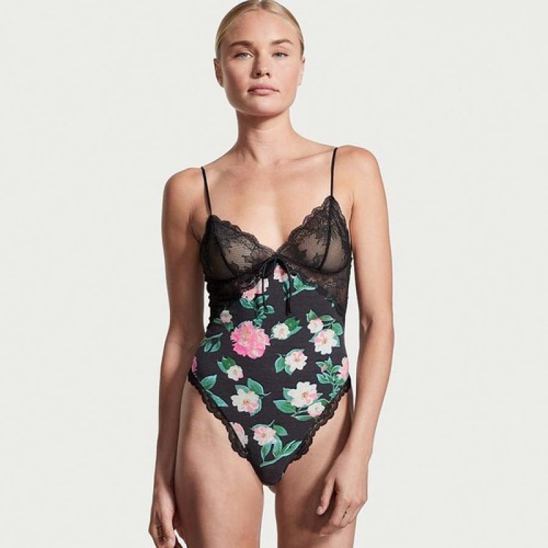 Victoria’s Secret Very Sexy Bodysuit with Bottom Button 132060QD5, Black with Flowers, Size S $85 |